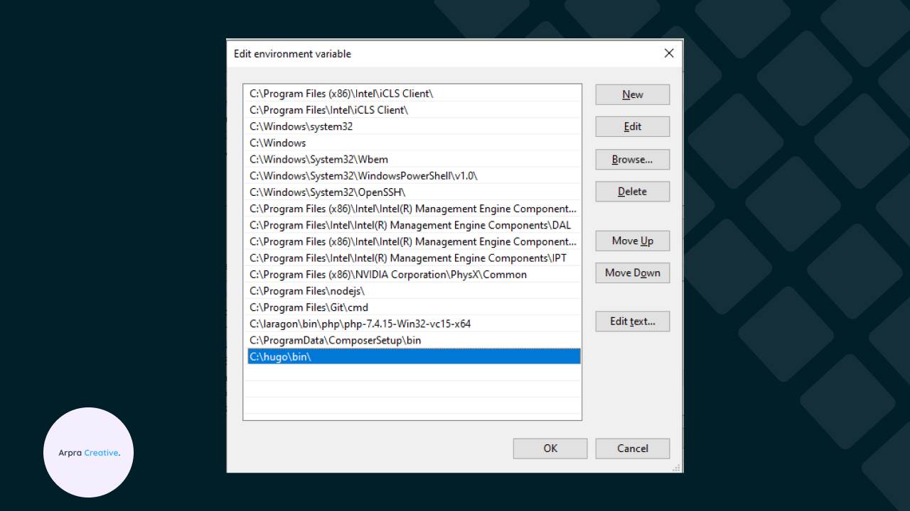 Kemudian teman-teman klik Environment Variables, kemdudian tambahkan Path seperti dibawah ini, jangan lupa untuk lokasi pathnya ada di C:\Hugo\bin\